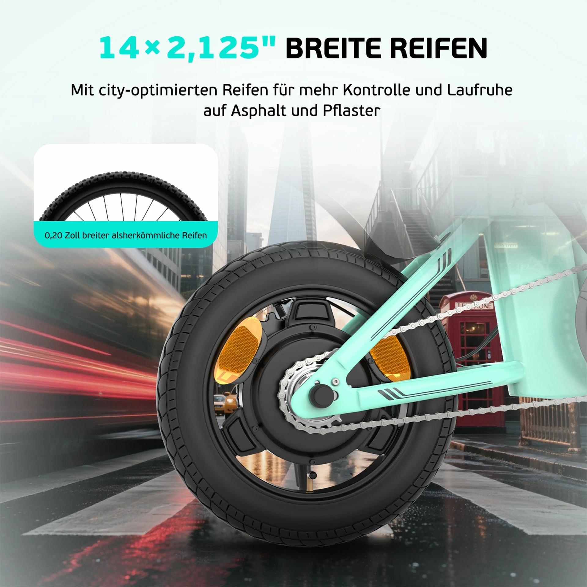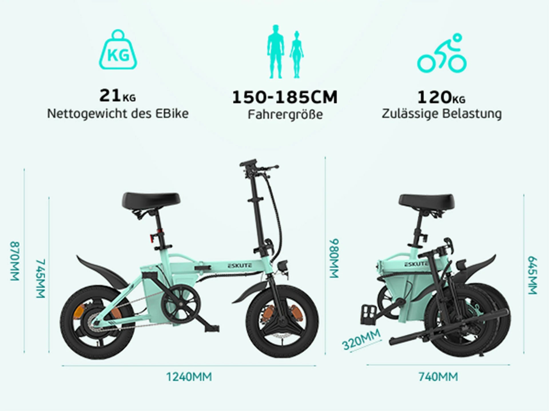 This e-bike meets all my needs for living in a European city. The maximum speed is appropriate for city streets and complies with local regulations. The battery range of 35-60km is perfect for daily commutes and weekend excursions. The 14-inch wheels are small enough for easy folding but large enough to handle cobblestone streets common in many European cities. The bike's net weight of 21kg is manageable for carrying up stairs to my apartment.
