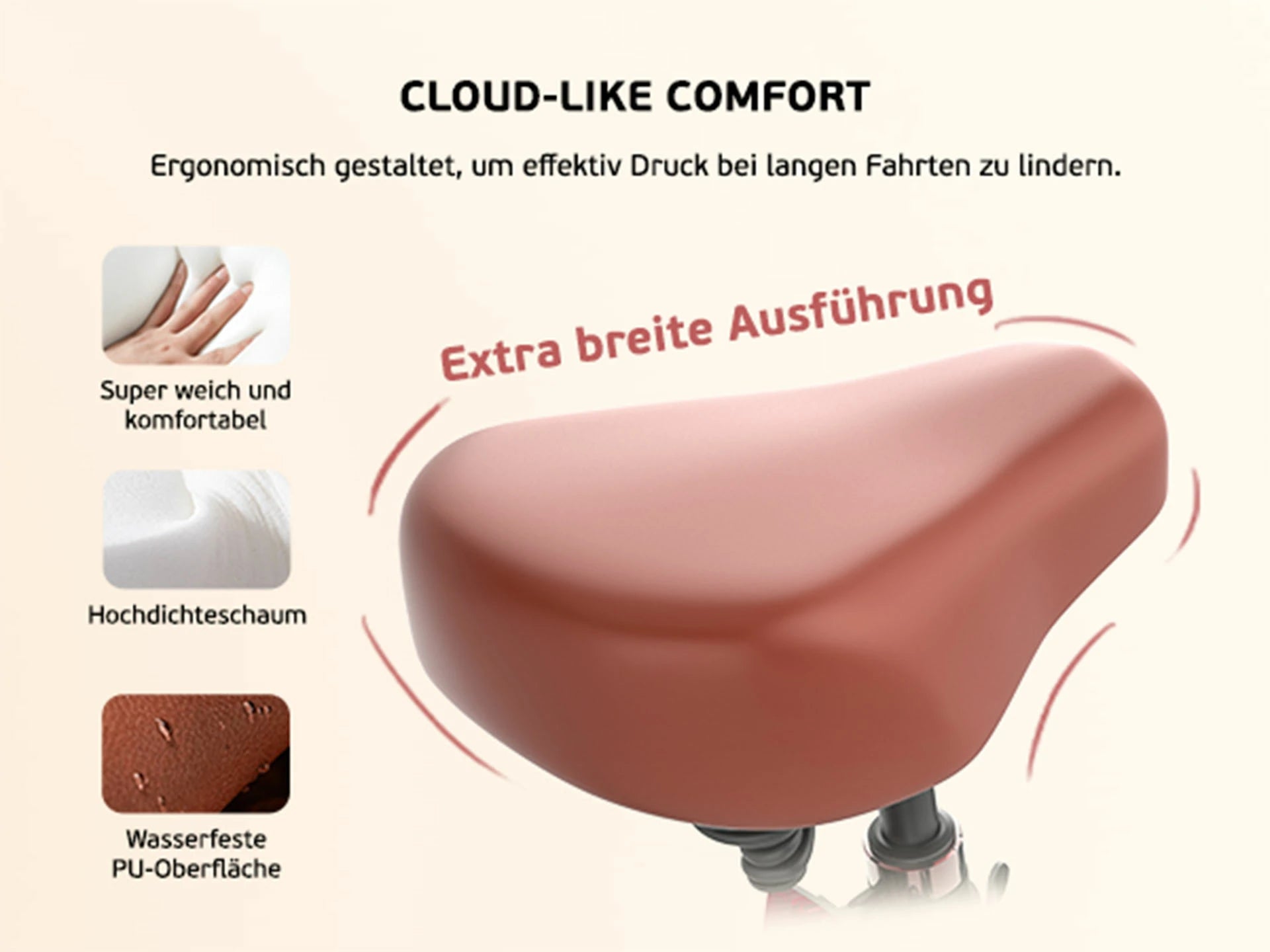 The bike feels safer than an electric scooter, with good stability and comfort thanks to the rear spring and seat post suspension. The phone holder with USB port is very useful. At 21 kg, it is not very light but easy to carry on public transport. The range is good, about 20–25 km.